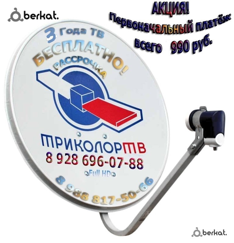 Триколор ТВ Рассрочка без процентов" Доставка, установка, подключение всего за 1490 руб. Первый месяц просмотра БЕСПЛАТНО!!! Далее по 450 руб ежемесячно. Абонентская плата на три года отсутствует! (Тоесть три года просмотр оплачен) АКЦИЯ ОГРАНИЧЕНА. Спутниковое телевидение ТРИКОЛОР ТВ. Качество изображения ULTRA HD 4К. Гарантия 3 года. Так же производим обмен в рассрочку вашей старой приставки, на новую ULTRA HD 4K всего за 1490 руб. Далее по 350 руб на два года. Обмен за наличку 5500 руб. Также производим настройку, вашей ?(антенны, устранение неполадок, замена кабеля, установка вашего телевизора на стену. Тел: 8(988)817-50-66 / 8(928)696-07-88