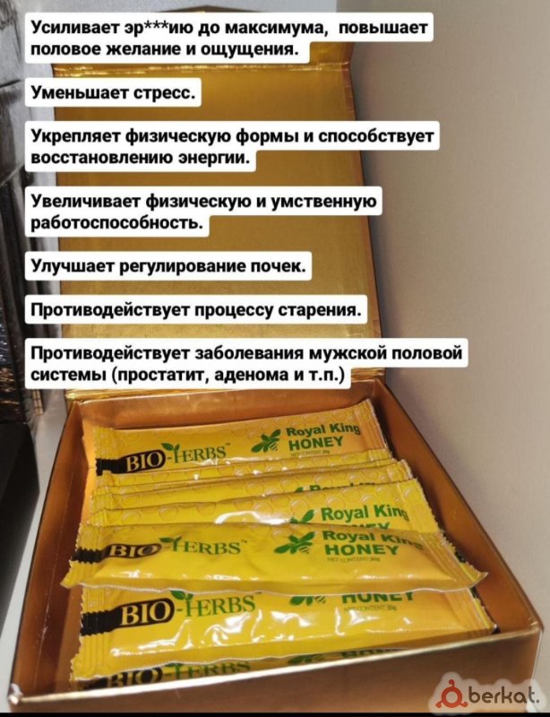 Полезные свойства: Усиливает эр***ию до максимума, повышает половое желание и ощущения. Уменьшает стресс. Укрепляет физическую формы и способствует восстановлению энергии. Увеличивает физическую и умственную работоспособность. Улучшает регулирование почек. Противодействует процессу старения. Противодействует заболевания мужской половой системы (простатит, аденома и т.п.). Состав: Натуральный тропический мед. Тонгкат Али. Маточное молок. Мака перуанская. Женьшень. Корень куркумы. Экстракт трюфеля и др. Способ употребления: Принимать 1/3 или 1/4 пакетика один раз в 2-3 дня, за пол часа ДО - еды, половой близости, и тренировок. Противопоказания: Высокое давление, диабет, детям не достигшим
