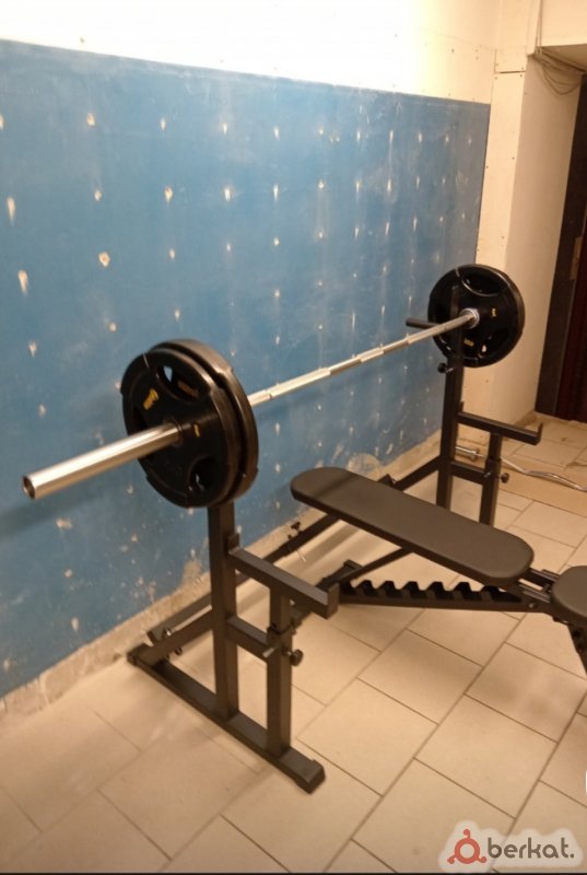 Скамья олимпийская. Гриф олимпийский с замками: длина 220см диаметр 51мм. Диски обрезиненные с отверстиями для пальцев по две штуки: 25кг, 15кг, 10кг. Итого гриф с дисками весит 120кг