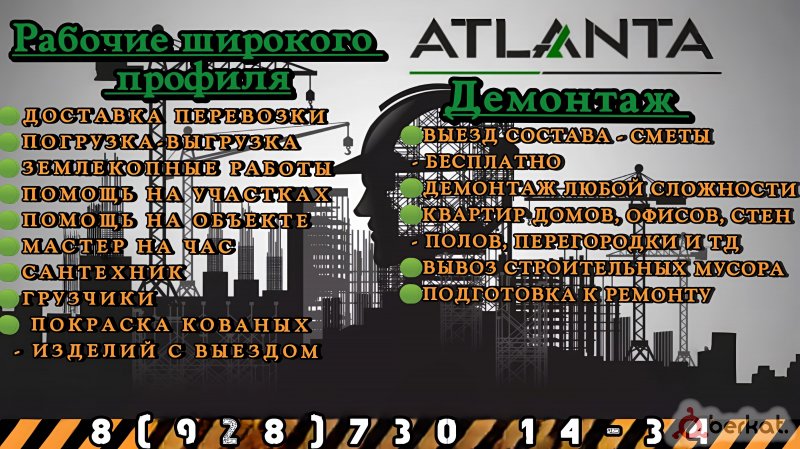 ## Услуги по демонтажу и ремонту Предлагаю профессиональные услуги по демонтажу и ремонту для квартир, домов и офисов. Вот что входит в перечень работ: - **Демонтаж любой сложности** — стен, полов, перегородок и других конструкций. - **Подготовка к ремонту** — полный комплекс предварительных работ. - **Вывоз строительного мусора** — быстро и аккуратно. - **Покраска ворот, дверей, оград, перил** с выездом на дом. - **Бесплатный выезд для составления сметы**. ### Рабочий широкого профиля Также выполняю различные вспомогательные работы: - доставка и перевозка грузов; - погрузка и выгрузка; - землекопные работы; - помощь на участках и объектах; - мастер на час; - услуги грузчиков. Хотите узнать